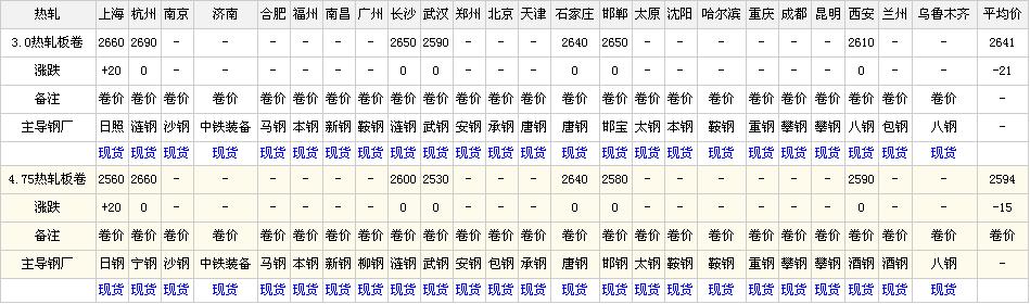 | 熱軋 | 上海 | 杭州 | 南京 | 濟南 | 合肥 | 福州 | 南昌 | 廣州 | 長沙 | 武漢 | 鄭州 | 北京 | 天津 | 石家莊 | 邯鄲 | 太原 | 沈陽 | 哈爾濱 | 重慶 | 成都 | 昆明 | 西安 | 蘭州 | 烏魯木齊 | 平均價 |