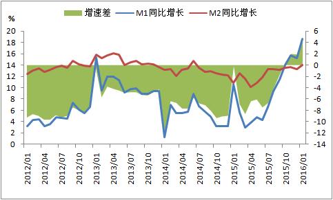 2016年1月末,M1和M2分別同比增長18.6%、14%,增速較上月同期提高3.4和0.7個(gè)百分點(diǎn)。其中,M2增速攀升,主要是信貸投放帶動派生存款大幅增加。M1增速攀升,主要是1月份央行通過開展逆回購、MLF、SLF等多元化貨幣政策工具向市場凈投放逾萬億元基礎(chǔ)貨幣。